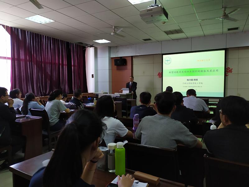报告结束后,陈教授详细解答了Si NPs的制备、Si QDs的荧光淬灭效率、荧光强度、荧光淬灭机理等化学系师生提出的问题。陈教授还介绍了兰州大学公司产品工作的经验与具体做法,与会师生听后受益匪浅。