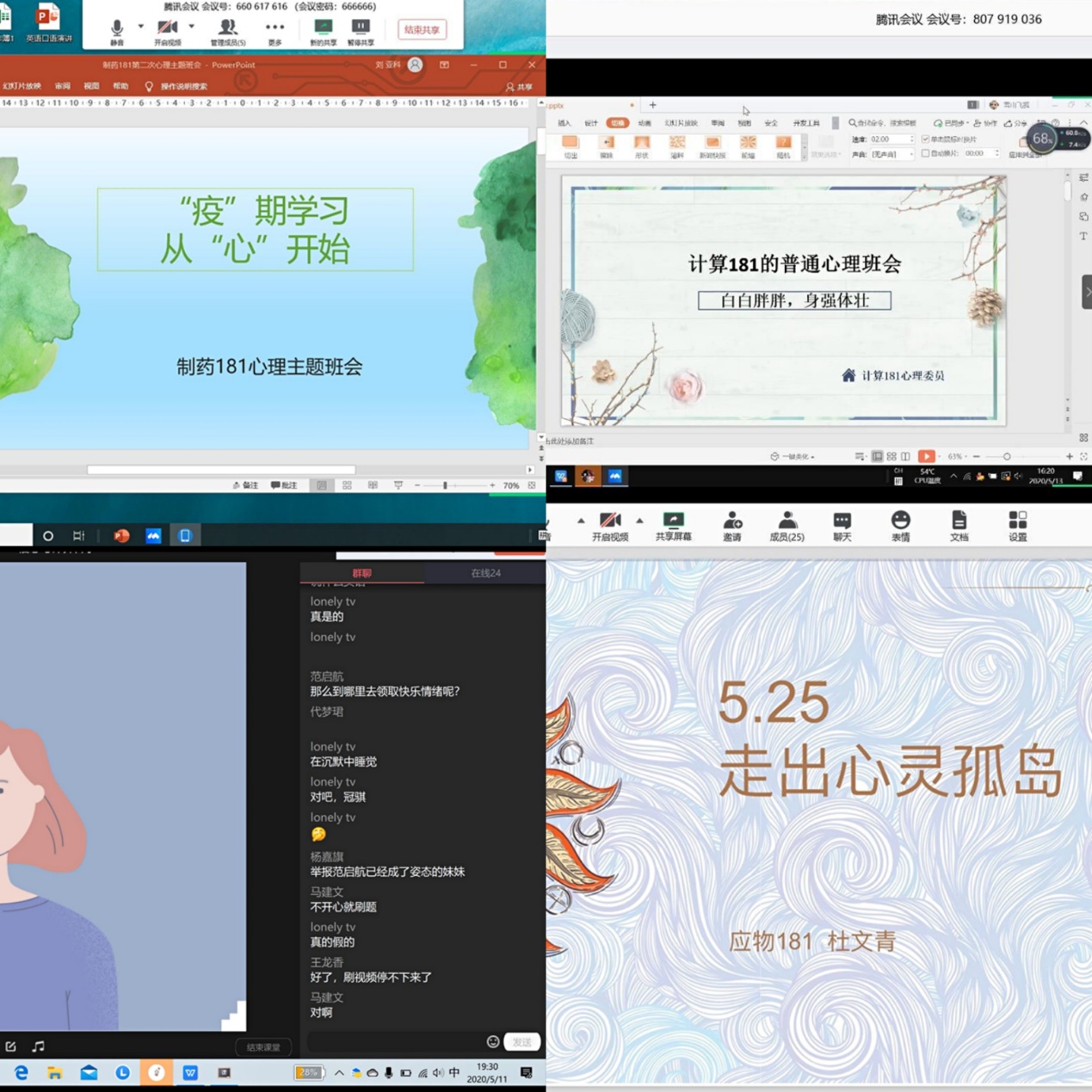 511日公司首先组织了各班心理委员在线上进行了培训,由负责公司心理工作的辅导员赵海伦对各位心理委员的班会PPT和讲稿进行了审核和修改,随后各班心理委员有序的在腾讯会议,腾讯课堂等APP上开展了线上班会。在班会中各位心理委员首先针对一些日常心理健康知识对同学们进行了普及,并就疫情期间同学们可能出现的心理状态,和居家学习过程中的自我规划安排问题进行了解答,并组织开展了典型心理案例的讨论;各班同学在班会上积极发言,向心理委员进行了提问和讨论。在各班班会结束后,各班心理委员递交了班会视频和班会总结,经过公司评选,推选2018级应化181班刘坤禹同学作为代表参与公司组织的心理健康最佳创意云班会评选活动。