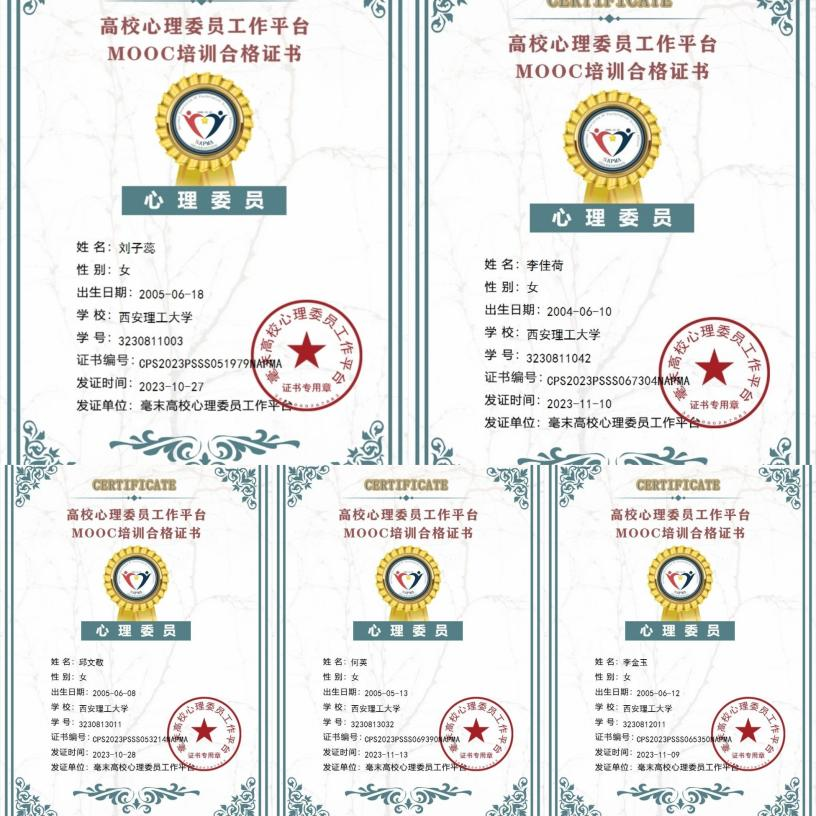 本次培训通过“全国高校心理委员工作平台”进行,以MOOC形式集中学习,培训内容涵盖了心理学基础知识、心理危机干预、心理咨询技巧等方面。在培训过程中,学员们积极参与讨论,分享学习心得,共同提升了心理健康服务水平。经过考核,所有学员均已取得由中国心理学会心理学标准与服务研究委员会认证的“心理委员MOOC培训合格证”。