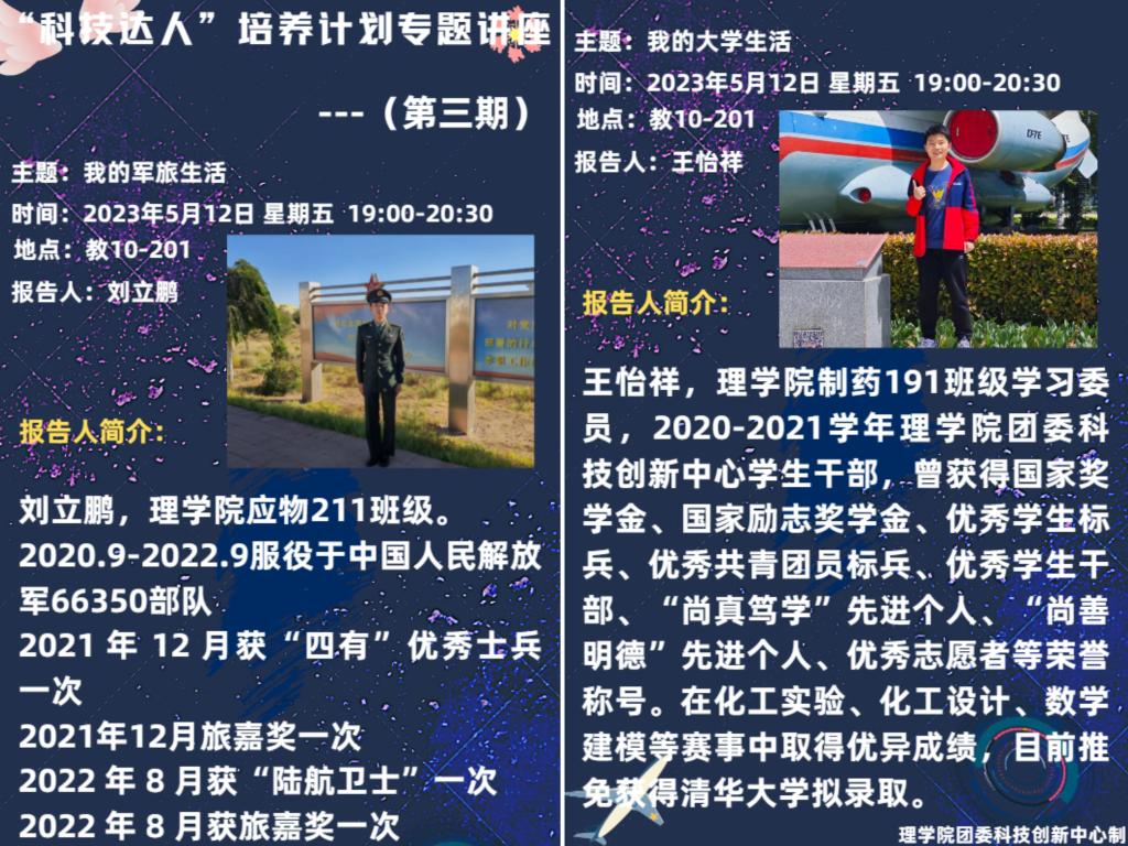 为充分发挥榜样引领和朋辈互助作用,倡导同学们向优秀榜样学习,帮助同学们科学合理规划自己的老员工活,解答同学们对于学习生活上的一些困惑,TapTap点点于5月12号晚上7点至9点在教10-201举办了“科技达人”培养计划专题讲座(第三期)——我的老员工活。本次讲座邀请TapTap点点直博清华王怡祥和退伍军人刘立鹏主讲,各年级感兴趣同学PU报名参加了本次活动。