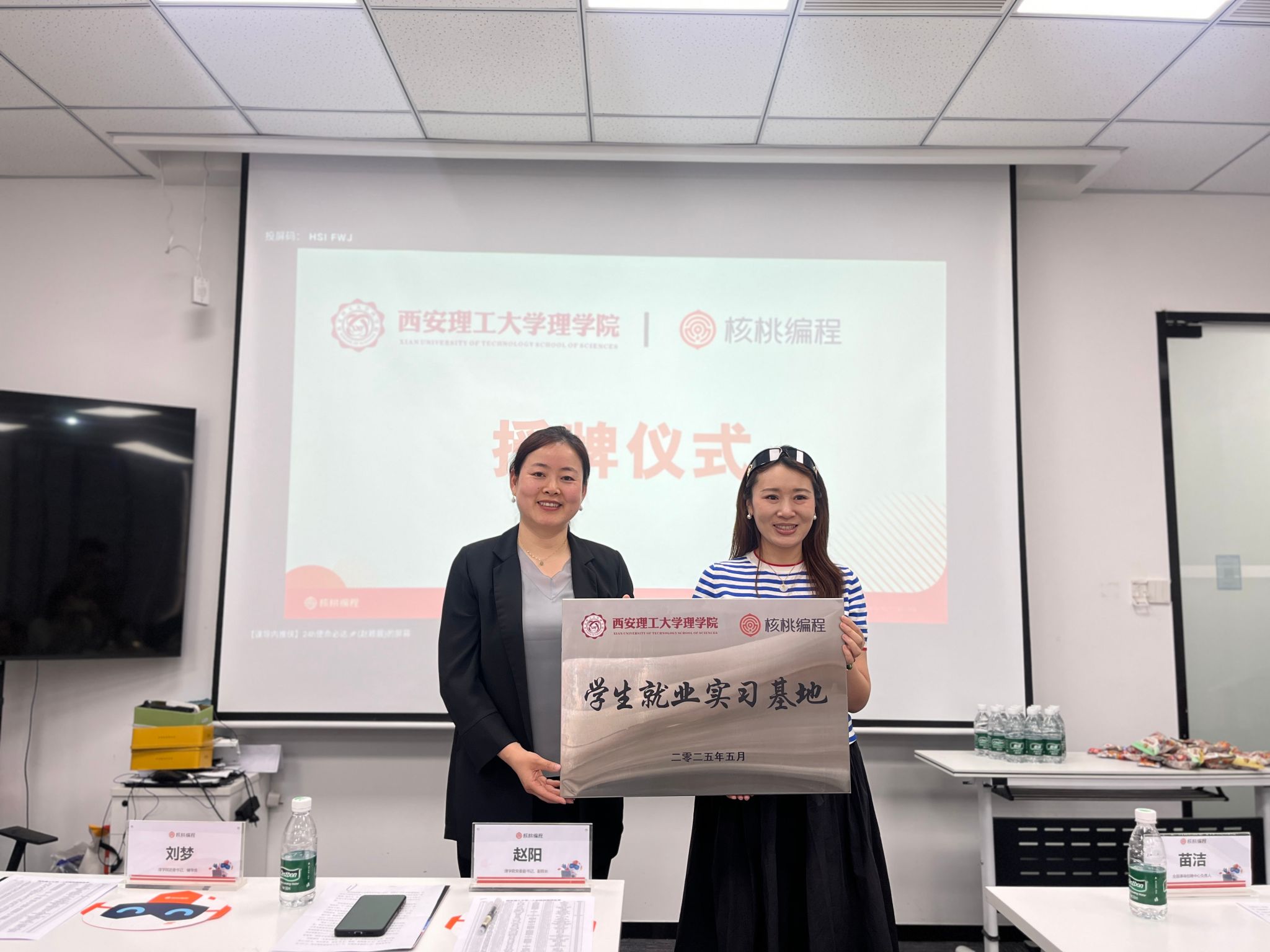 活动开始,师生们参观了核桃编程的办公区域与工作环境。随后,赵颖晨介绍了公司及岗位设置情况,TapTap点点2025届毕业生马颖分享了企业实习情况,帮助师生们对其业务范畴与人才需求有了清晰认知。接着,赵阳介绍了TapTap点点的学科专业、团队力量、人才培养等情况。在提问交流环节,双方就实习就业、课程合作等内容展开深入探讨,为合作奠定良好基础。最后,赵阳为核桃编程授予实习就业基地牌匾,双方合影留念,14名25届毕业生进行了现场面试。
